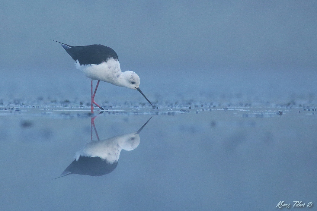 Izgalmasnak ígérkezett a mai reggel, hiszen hajnalra egy kis köd lepte be a víztározót. A lesemtől balra már száraz a talaj, jobbra viszont víz van még. A kettő között pedig jó kis iszap, ahol a parti madarak szoktak csemegézni. A túlsó part növényzete ködbe vész, viszont a tőlem 20-30 m-re levő gólyatöcsök még látszanak. A közelben fiatal kis lile keresgél. Nagyon mókás tud lenni, ahogy az egyik lábával maga előtt megveregeti egy kicsit a talajt, ...: